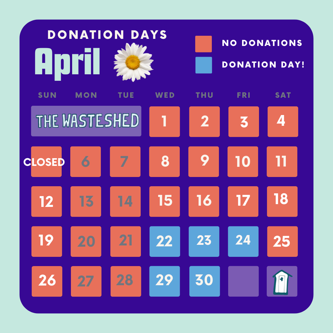 The WasteShed has two locations available for accepting donations. Each center has its own capacity and may have holds on specific items. Be sure to call the location you are donating to before you arrive to ensure they are still accepting what you would like to donate.